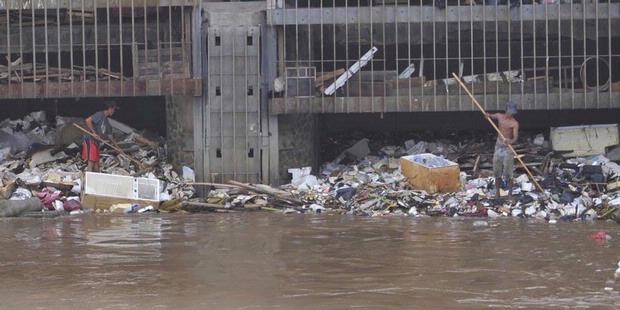 Pemulung memunguti botol plastik bekas di antara sampah yang terbawa air dan menumpuk di Pintu Air Manggarai, Jakarta.